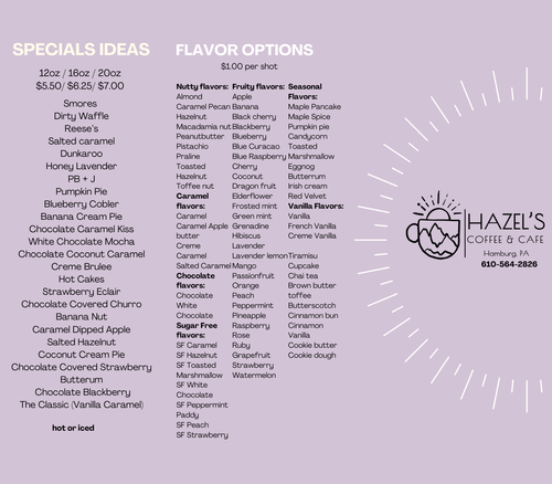 Nestled in the heart of Hamburg, Hazel's Cafe is your go to spot for a great cup of coffee, freshly baked pastries, biscuits and gravy, and much more! With a passion for quality and a love for our community, we invite you to relax and unwind in our cozy cafe.